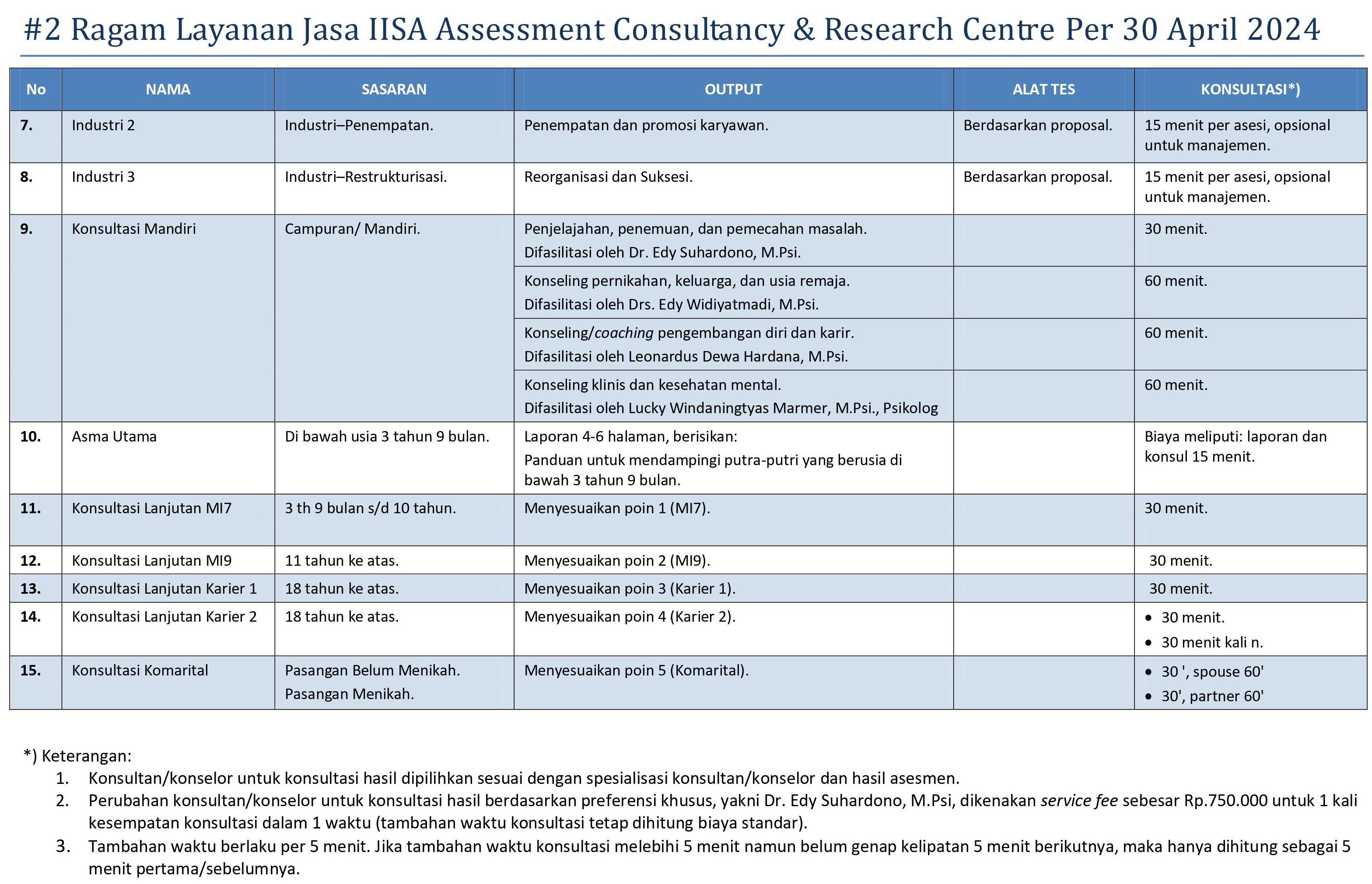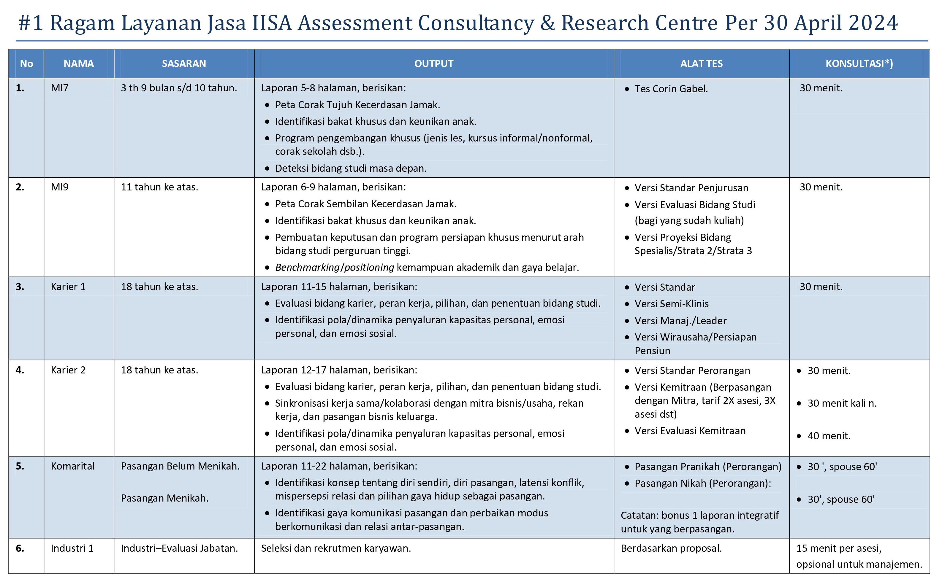Berikut informasi terkait Ragam Layanan Jasa IISA Assessment, Consultancy & Research Centre Per 30 April 2024.